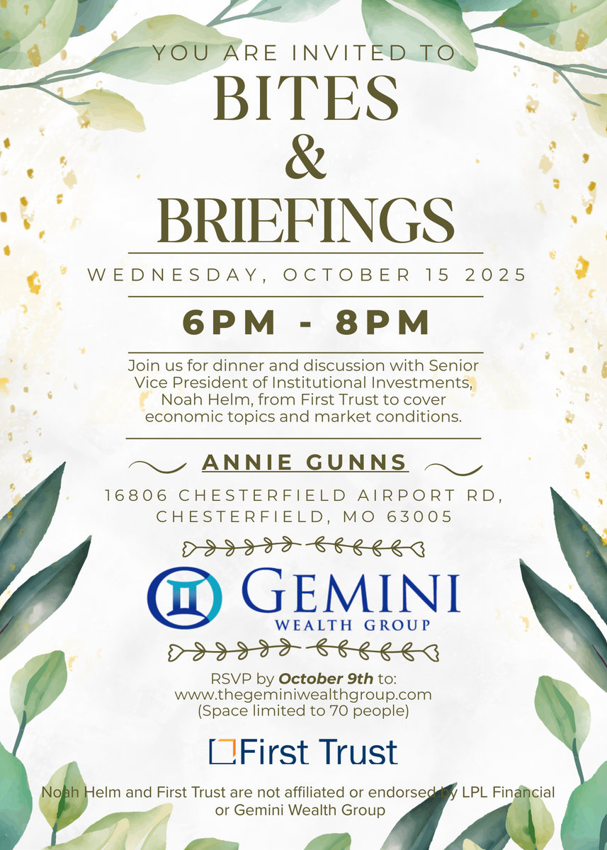 Join us for dinner and economic update at a St. Louis favorite, Annie Gunn's. Presentation by First Trust Sr. Vice President of Institutional Investments, Noah Helm. Noah will cover current economic topics and market conditions as well as a Q and A session. This event is open to current clients as well as guests. Please RSVP quickly as space is limited.